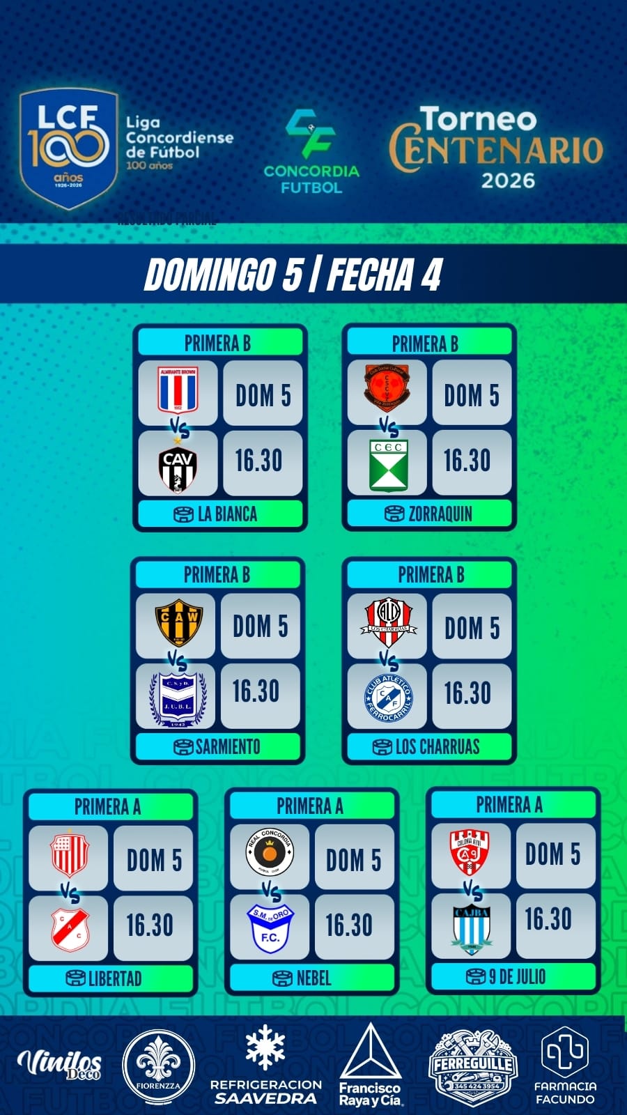 Tras la suspensión total de la actividad del sábado por las lluvias, la Liga Concordiense de Fútbol tiene programada para este domingo la continuidad de la cuarta fecha del Torneo Centenario Apertura 2026.