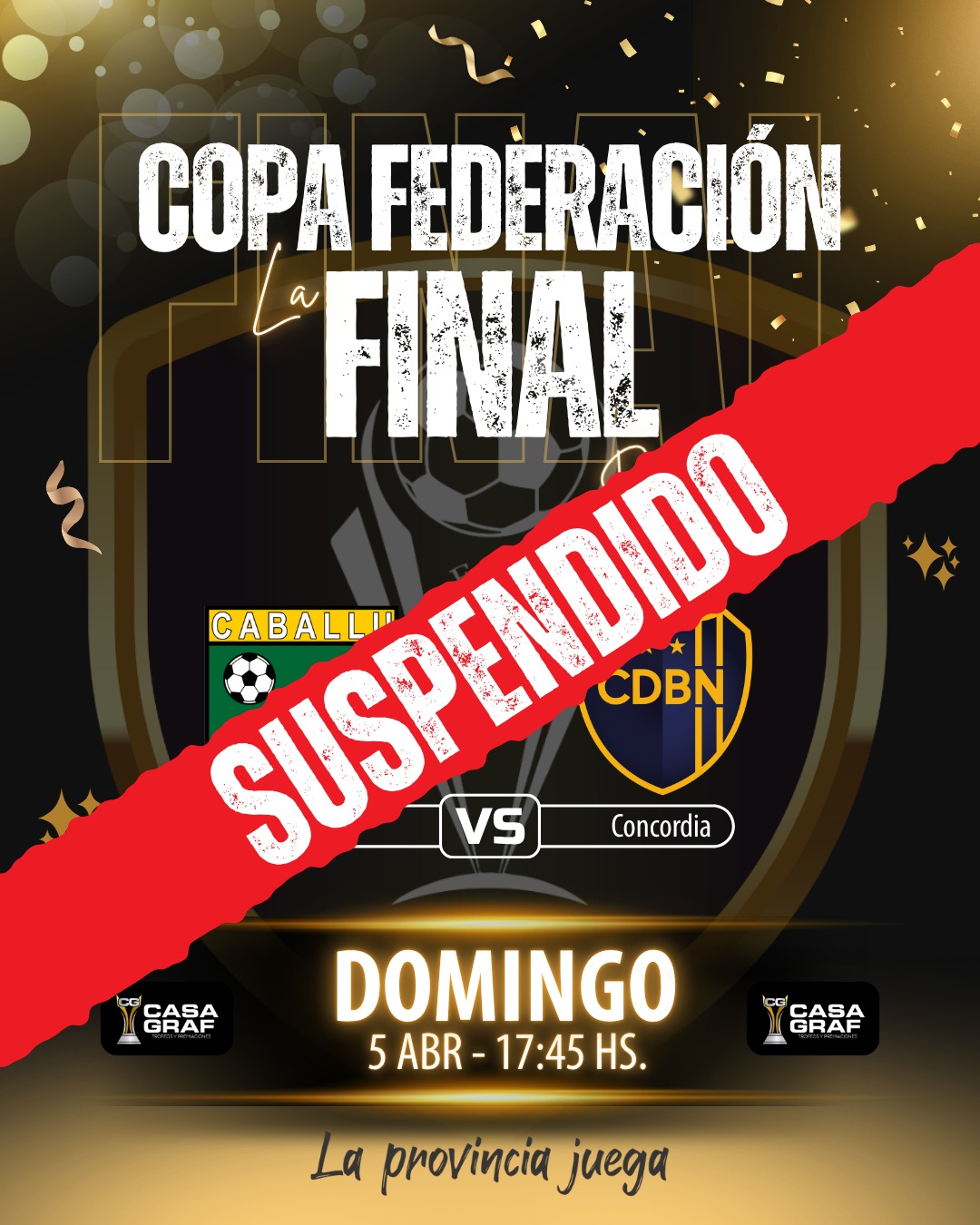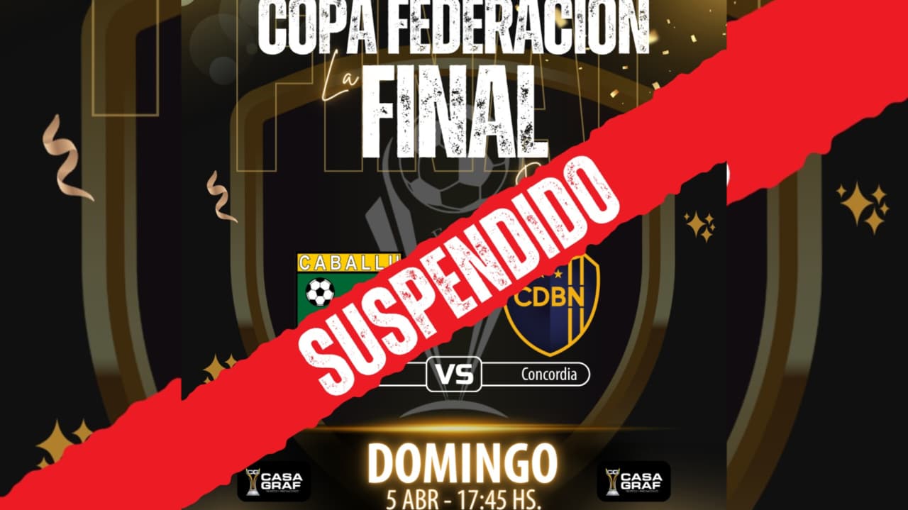 La Federación Entrerriana de Fútbol informó la suspensión del encuentro de ida de la final de la Copa Federación entre Nebel y Caballú de La Paz, que estaba programado para este domingo.