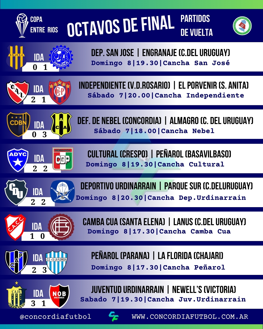 La particularidad de esta instancia es que varios equipos llegan con ventaja, luego de golpear de visitantes y ahora deberán revalidarla como locales. San José, Independiente de Villa del Rosario, Camba Cuá de Santa Elena, Peñarol de Paraná y Juventud Urdinarrain ganaron fuera de casa en los primeros noventa minutos y este fin de semana intentarán cerrar la serie ante su gente, en un contexto que, al menos en los papeles, les resulta favorable.