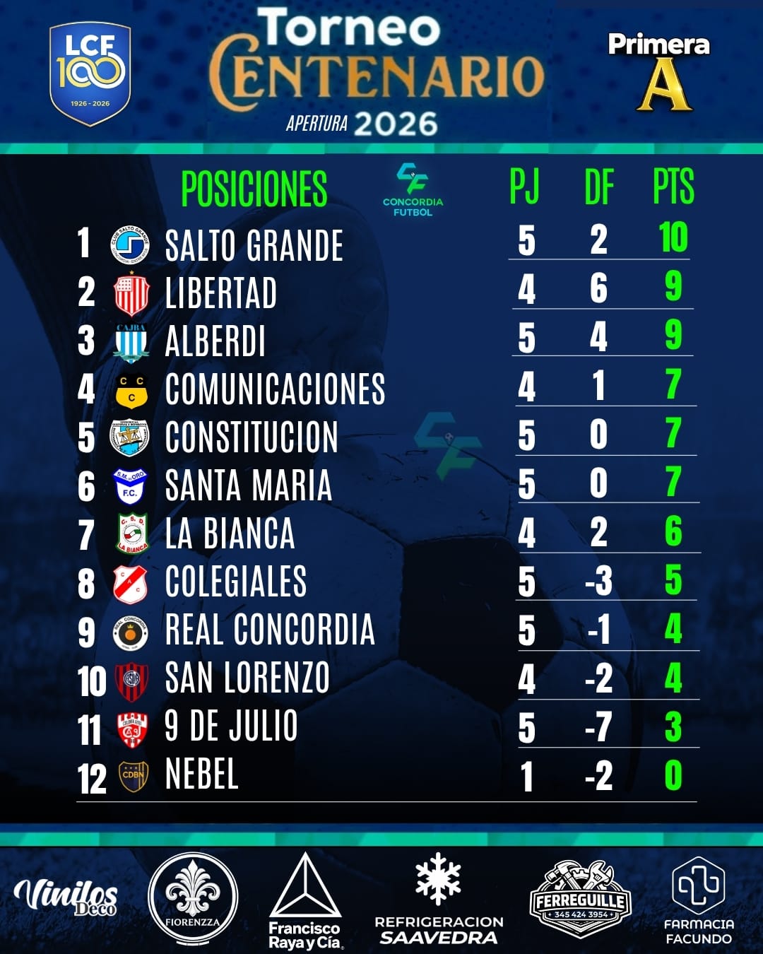 Con estos resultados, la tabla comienza a acomodarse. Salto Grande lidera con 10 puntos, seguido de cerca por Libertad con 9 y un encuentro pendiente. Más atrás aparece Comunicaciones con 7 unidades, también con un partido menos, dentro de un grupo que se mantiene apretado en la zona media-alta.