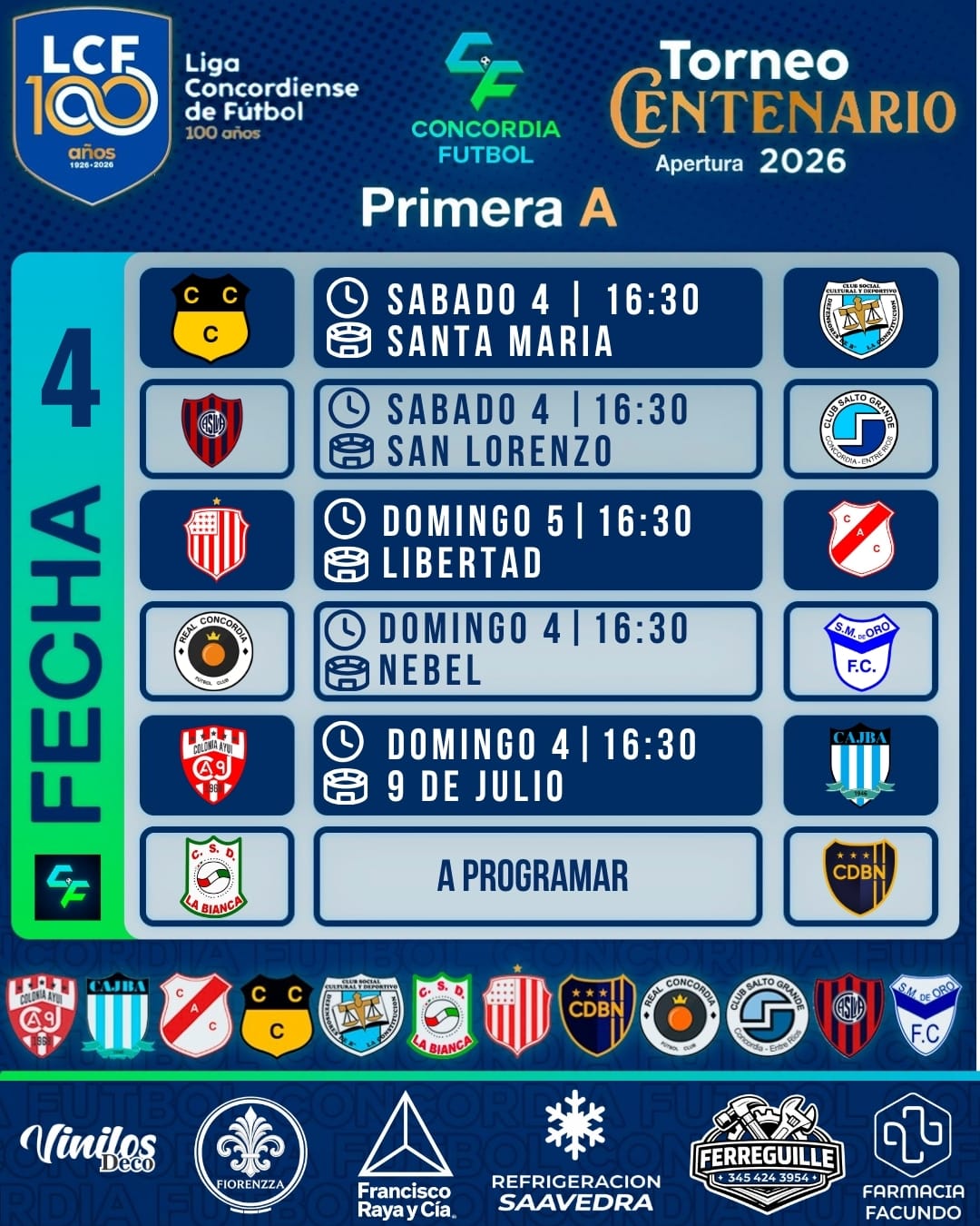 El Torneo Centenario Apertura 2026 de la Liga Concordiense de Fútbol tendrá continuidad este fin de semana con la disputa de la cuarta fecha, que comenzará el sábado con dos encuentros y se completará el domingo con los tres restantes. La jornada tendrá además un partido pendiente, ya que Nebel volverá a postergar su presentación por su participación en Copa Federación.